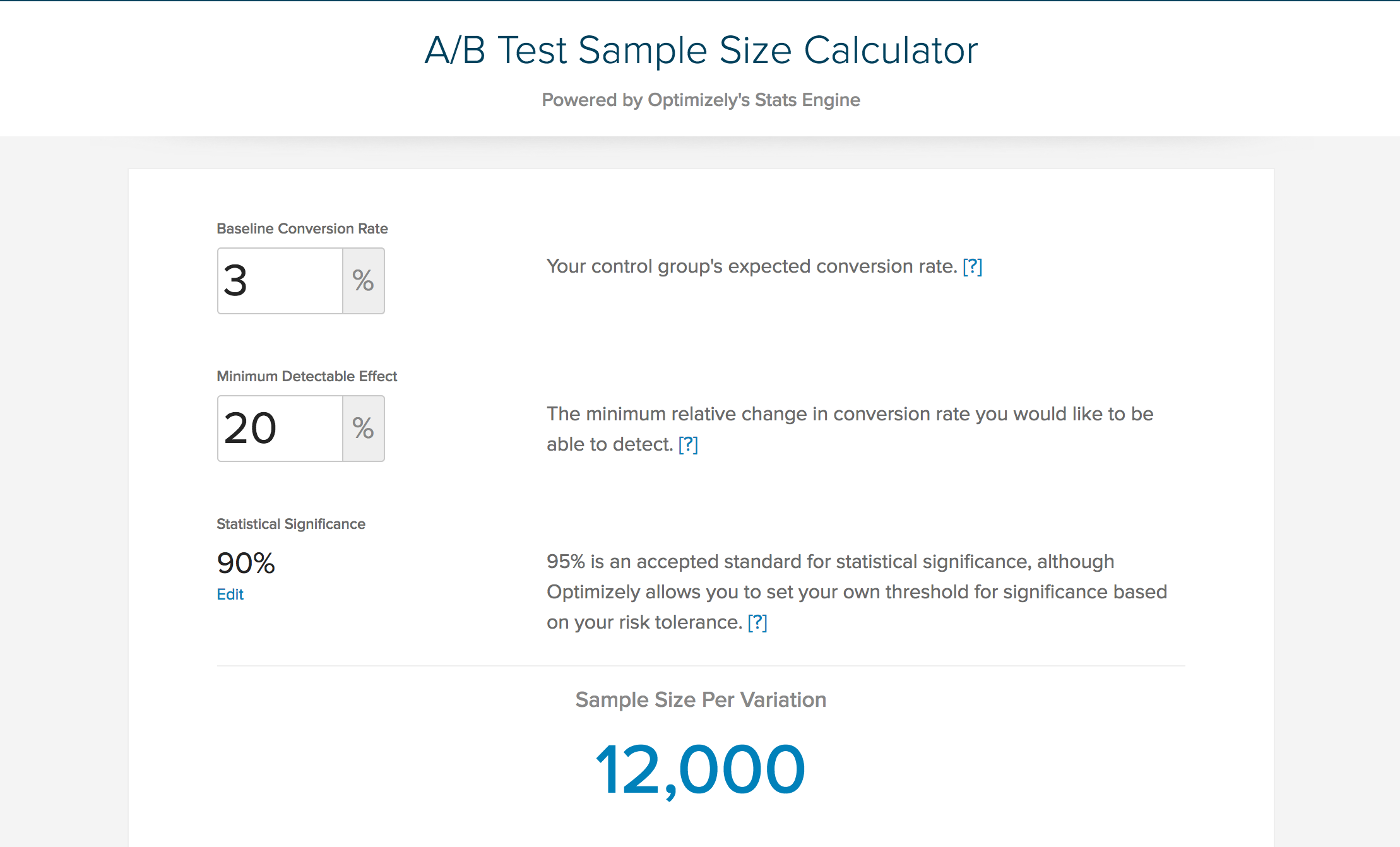 To determine the sample size for the test, we can use this calculator: https://www.optimizely.com/sample-size-calculator/