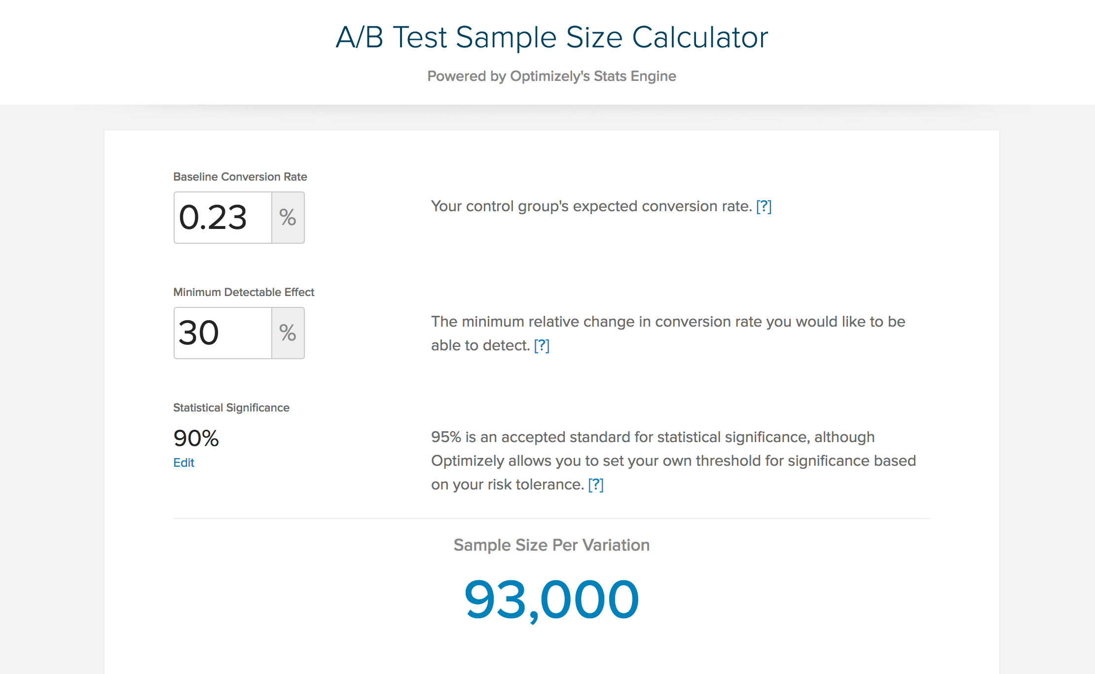 Filling in 0.23% for baseline conversion rate and 30% for MDE, we will see that the required sample size is 93,000. This means we can safely stop the A/B test once each variant is seen by 93,000 people. We can adjust the MDE we are comfortable with to derive at a sample size that will not take too long to reach.